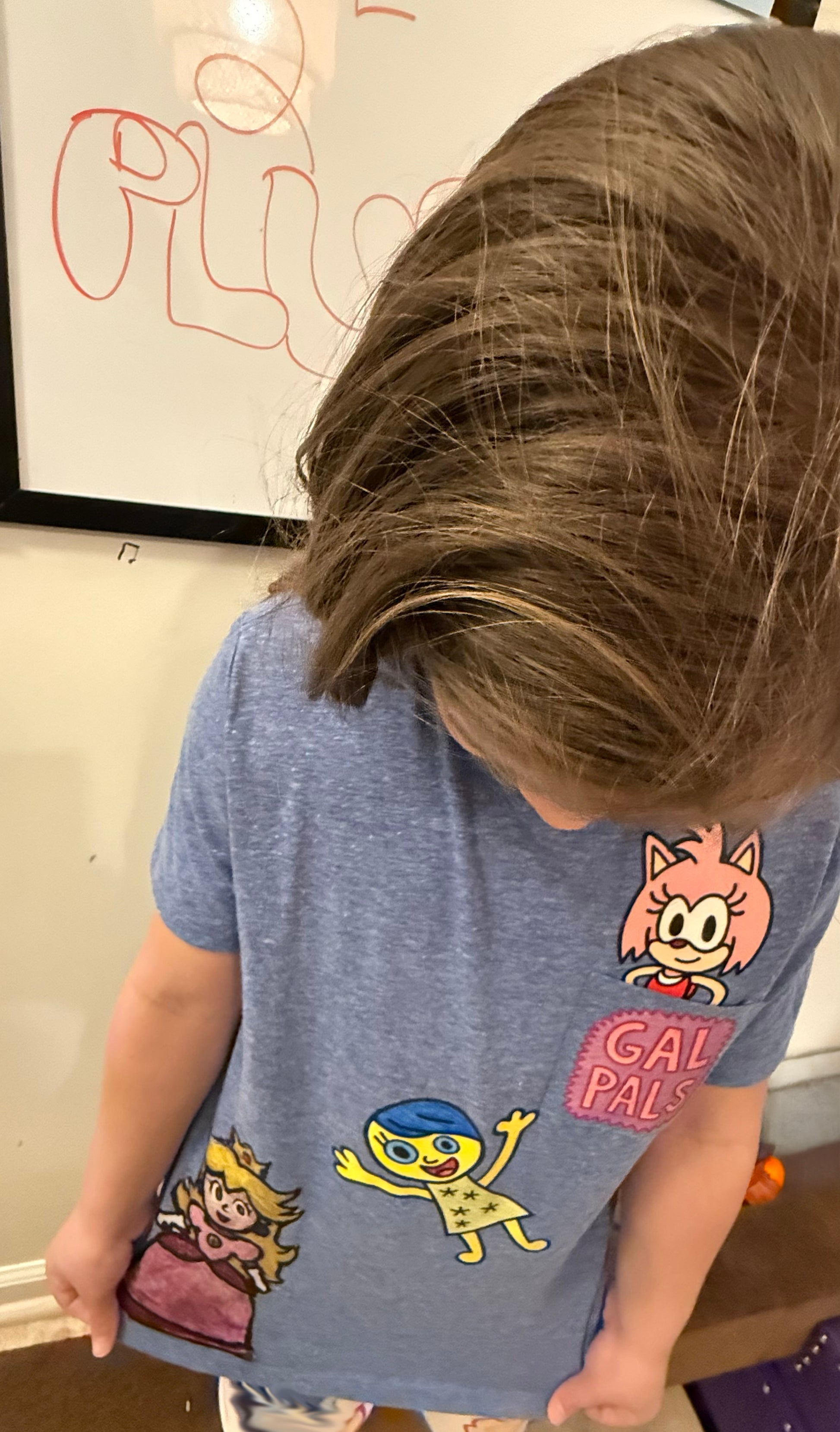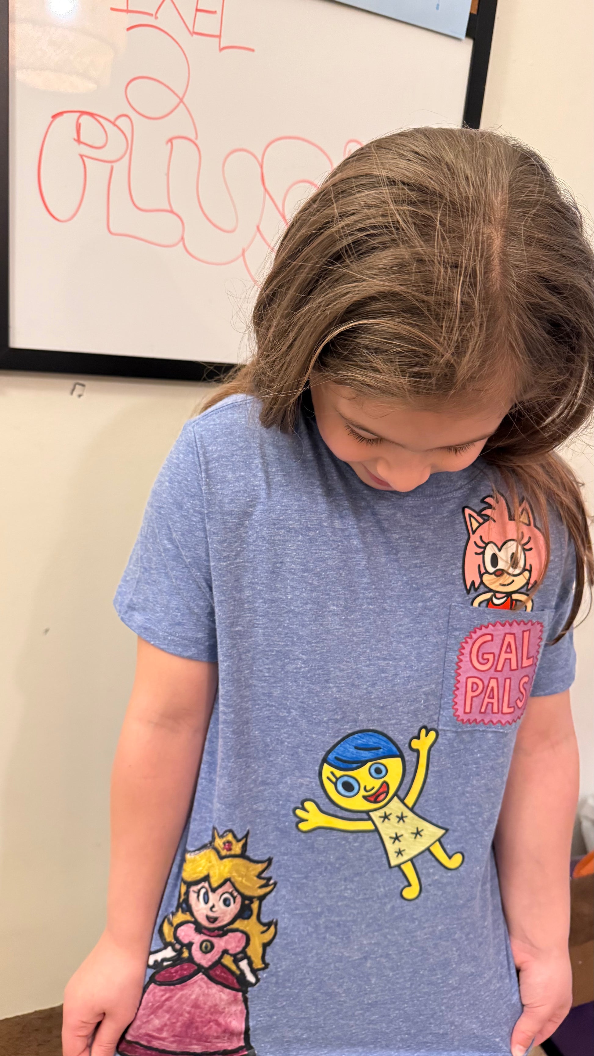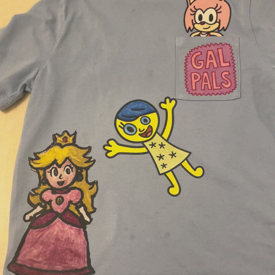 Rep your love of some of your favorite girl characters with this awesome Tee-shirt. Joy is literally "hanging out", with Amy chillen in your pocket. Princes Peach is rounding out the trio, with the awesome Gal Pals logo on the pocket.